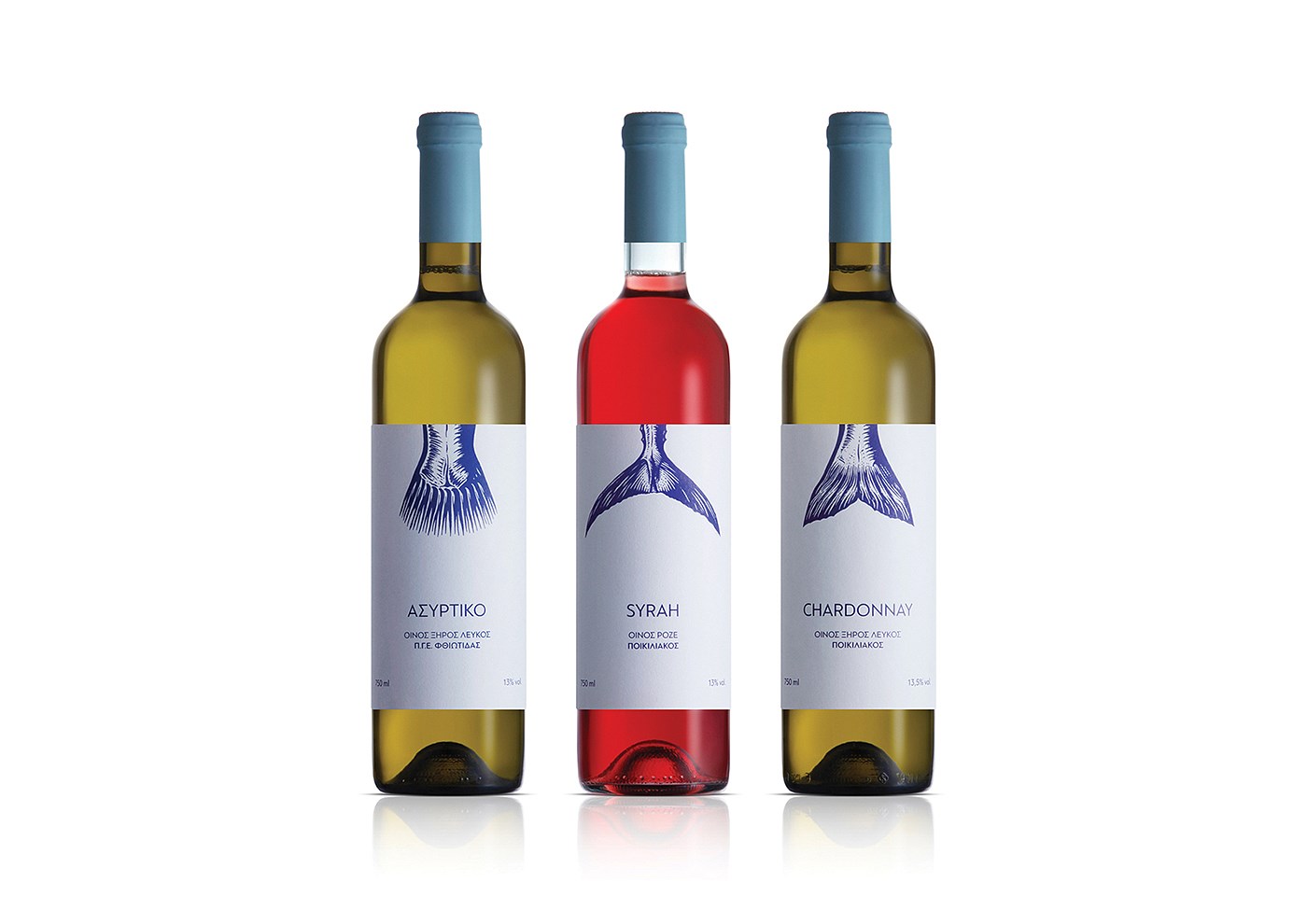 Οι τρεις ετικέτες που σχεδιάστηκαν για τα house wines του καταστήματος (Ασύρτικο, Chardonnay & Syrah), οπτικοποιούν με τρεις εικονογραφήσεις τρία διαφορετικά είδη ψαριών (βλάχο, τόνο & φαγκρί).