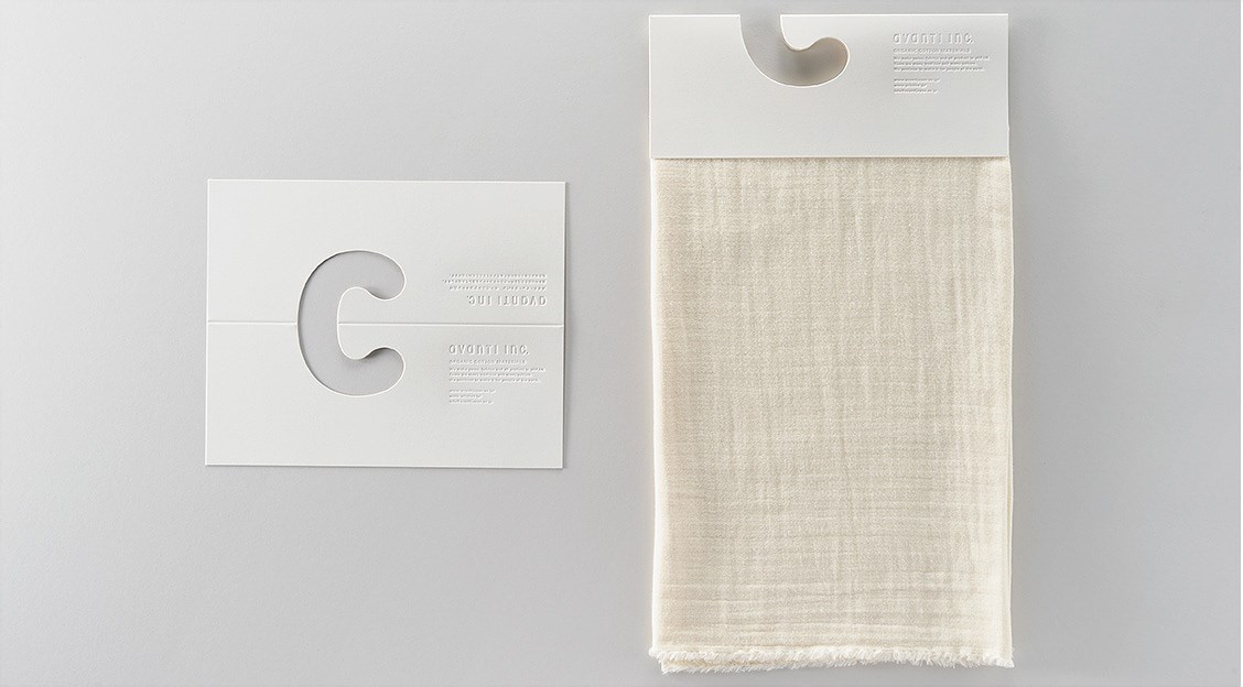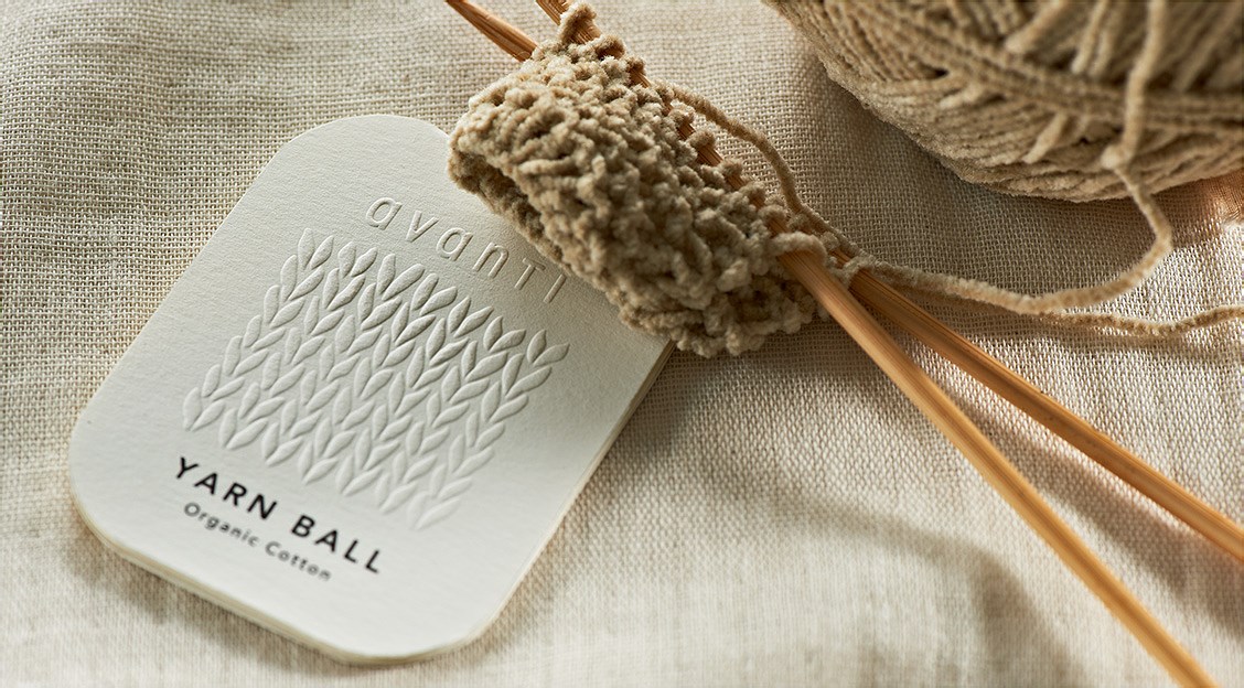オーガニックコットンブランド「プリスティン」より。生地ハンガーは、素材のふくよかな風合いが引き立つようあえて主張しないデザインに。手芸用の糸玉は、端切れ布の結び方を何度も検証し、ゴミにならず、保管しやすい独自の形状を考案しました。エンボスの陰影で編み目を表現したタグとともに、企業の思想を静かに伝えます。