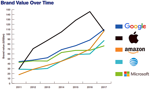 2017年全球最有價值的品牌前10強,依序為,Google、Apple、Amazon、AT&T、Microsoft、Samsung、Verizon、Walmart、Facebook和ICBC。排名第一的Google,除了2016年搜尋廣告收入增長20%,行動作業系統Android和Chrome瀏覽器都佔有一席之地,YouTube更讓Google的品牌霸主地位更加鞏固。
